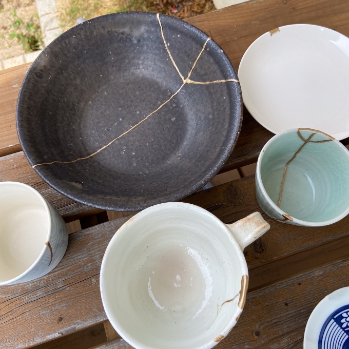 島の古い家から引きとられた古食器の欠けや割れを、簡易金継ぎで修復。直した器はお持ち帰りできます。