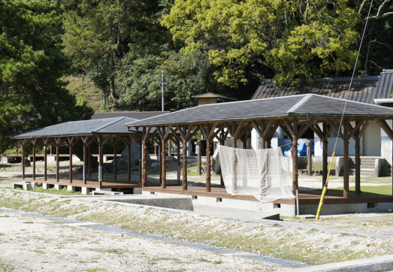 海水浴場が広がる手前に調理台・飯盒炊飯用釜戸・洗い場(上水道)を備えた炊事棟、水洗トイレ、野営場があります。また陸側の鹿島渡船待合所にはリヤカーの無料貸出を行っています。