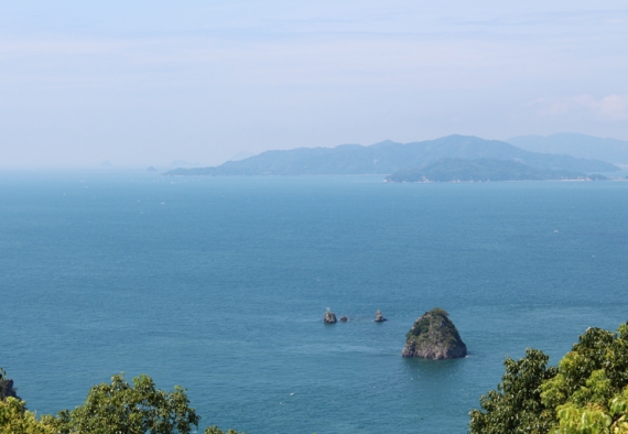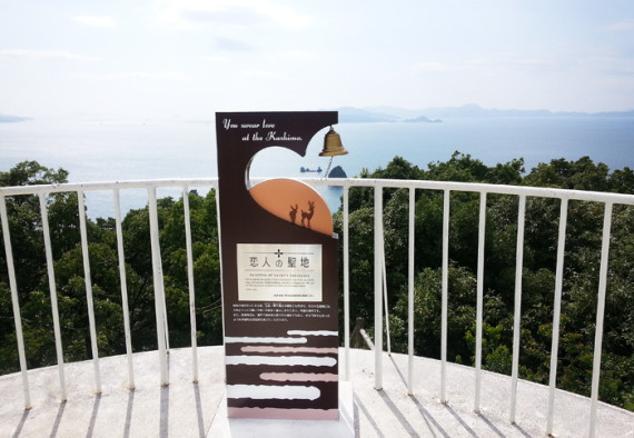 松山市北条の西方海上に浮かぶ鹿島山頂にある展望台は、キャンプ場の横にある登山口と渡船場からすぐの場所の2箇所から登れ、標高約113.8mで徒歩約20分です。火山性の岩がゴロゴロ露出した山頂にある白い展望台からは、北条鹿島祭りで大注連縄の張替えを行う玉理と寒戸や小鹿島、奥に睦月島など瀬戸内の島々と青い海、北条の町並や連なる山々など360度見渡せるパノラマの世界。そして恋人の聖地サテライトに認定された鹿島の展望台には「幸せの鐘」があり、夫婦岩を見ながら2人で鐘を鳴らすと恋が成就するかも!と言われています。